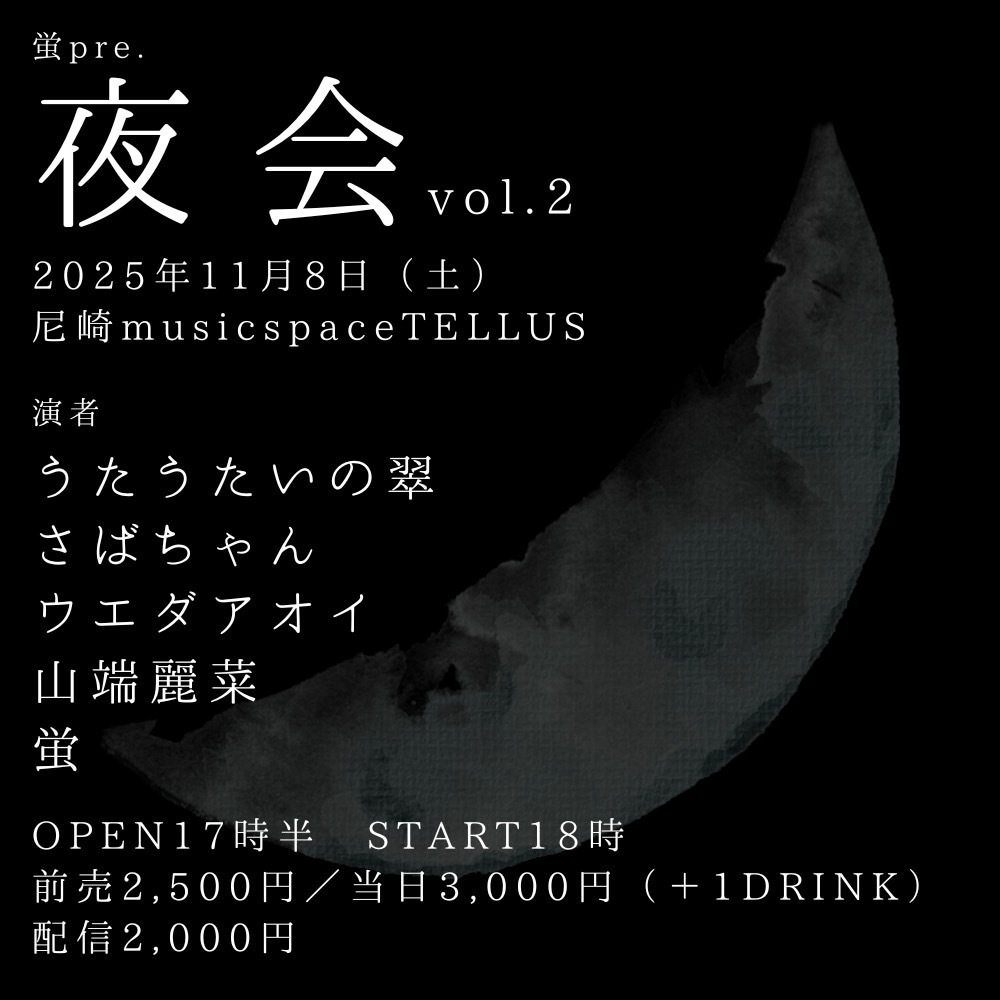 蛍pre. 夜会 vol.2 SCHEDULE 2025/11/08(土) - 2025/11/09(日) musicspace TELLUS OPEN 17:30 / START 18:00 ADV ¥2,500 / DOOR ¥3,000 出演時間♫18:00〜 w/ 蛍 / 山端麗菜 / ウエダアオイ / さばちゃん 配信チケットはこちら URLをコピーする 報告する