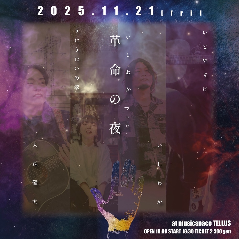 いしわかpre. 革命の夜 SCHEDULE 2025/11/21(金) - 2025/11/22(土) musicspace TELLUS OPEN 18:00 / START 18:30 TICKET ¥2,500 出演時間♫19:40〜 w/ いしわか / いとやすけ / 大森健太 URLをコピーする 報告する