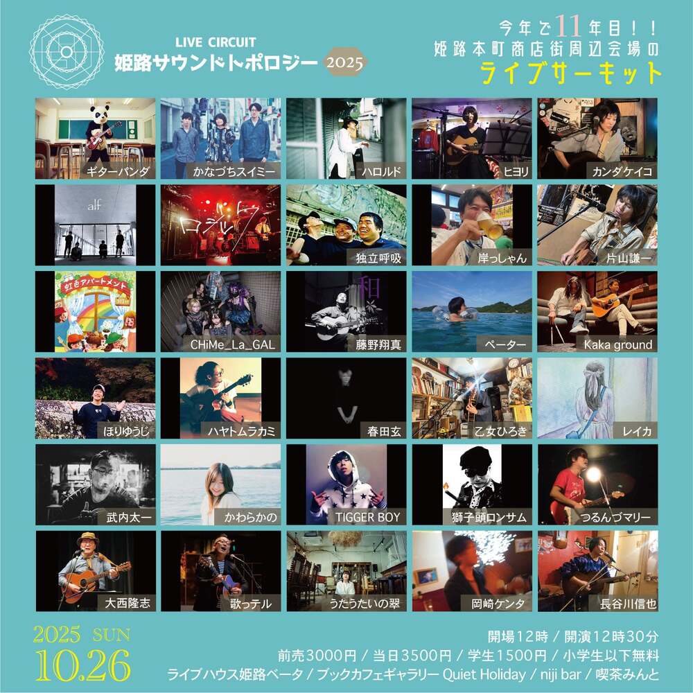 姫路サウンドトポロジー2025 SCHEDULE 2025/10/26(日) - 2025/10/27(月) 姫路ベータ/ Quiet Holiday /niji bar/ 喫茶みんと(姫路4会場サーキット) OPEN 12:00 / START 12:30 ADV ¥3,000 / DOOR ¥3,500 w/出演者多数!! URLをコピーする 報告する