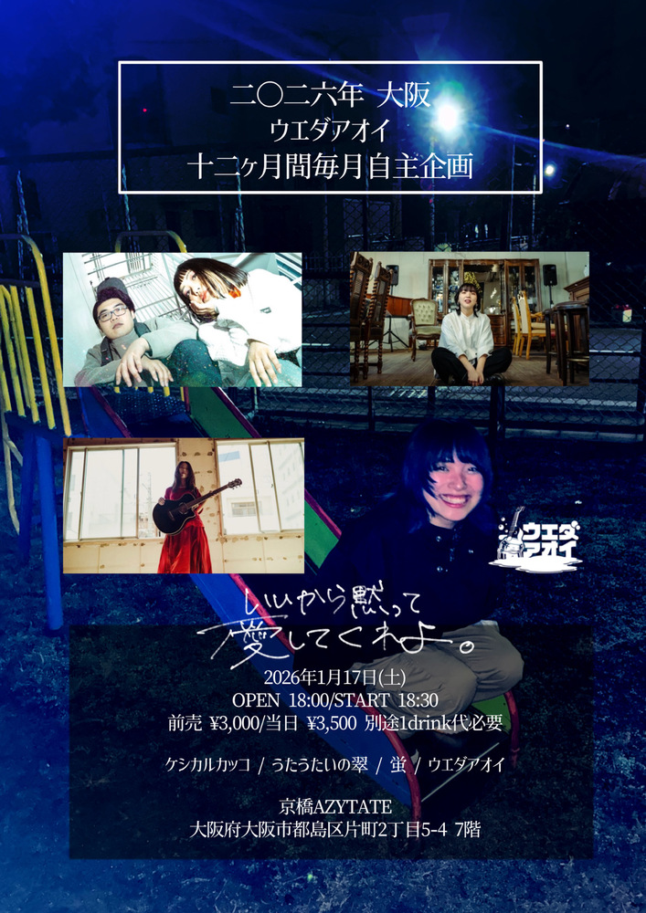 ウエダアオイpre. いいから黙って愛してくれよ。 SCHEDULE 2026/01/17(土) - 2026/01/18(日) 京橋AZYTATE OPEN 18:00 / START 18:30 ADV ¥3,000 / DOOR ¥3,500 w/ ウエダアオイ / ケシカルカッコ / 蛍 URLをコピーする 報告する