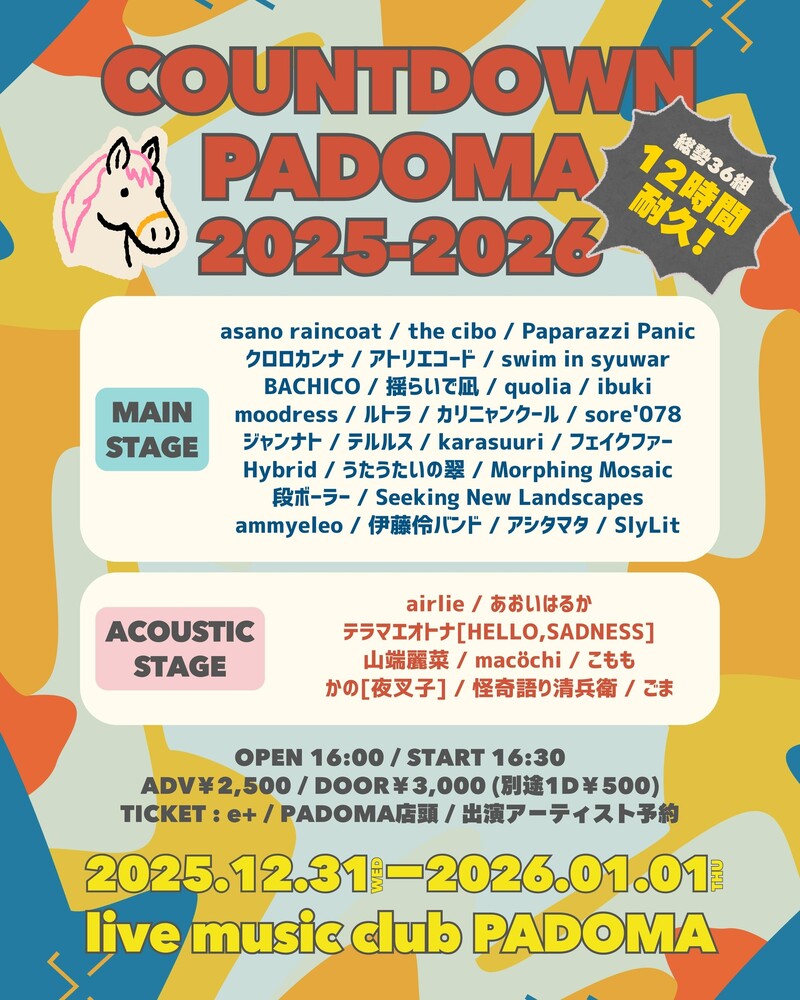 COUNTDOWN PADOMA 2025-2026 SCHEDULE 2025/12/02(火) - 2025/12/03(水) PADOMA OPEN 16:00 / START 16:30 ADV ¥2,500 / DOOR ¥3,000 出演:♫18:50〜 w/ 出演者多数 配信こちら URLをコピーする 報告する