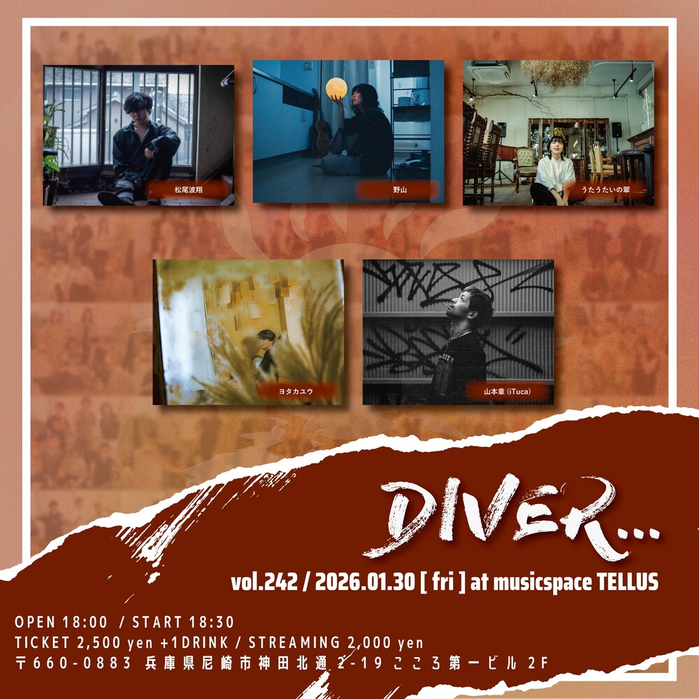 DIVER...vol.242 SCHEDULE 2026/01/30(金) - 2026/01/31(土) musicspaceTELLUS OPEN 18:00 / START 18:30 TICKET ¥2,500 出演時間♫20:50〜 w/ 山本章(iTuca) / 野山 / ヨタカユウ /松尾波翔 配信こちら! URLをコピーする 報告する