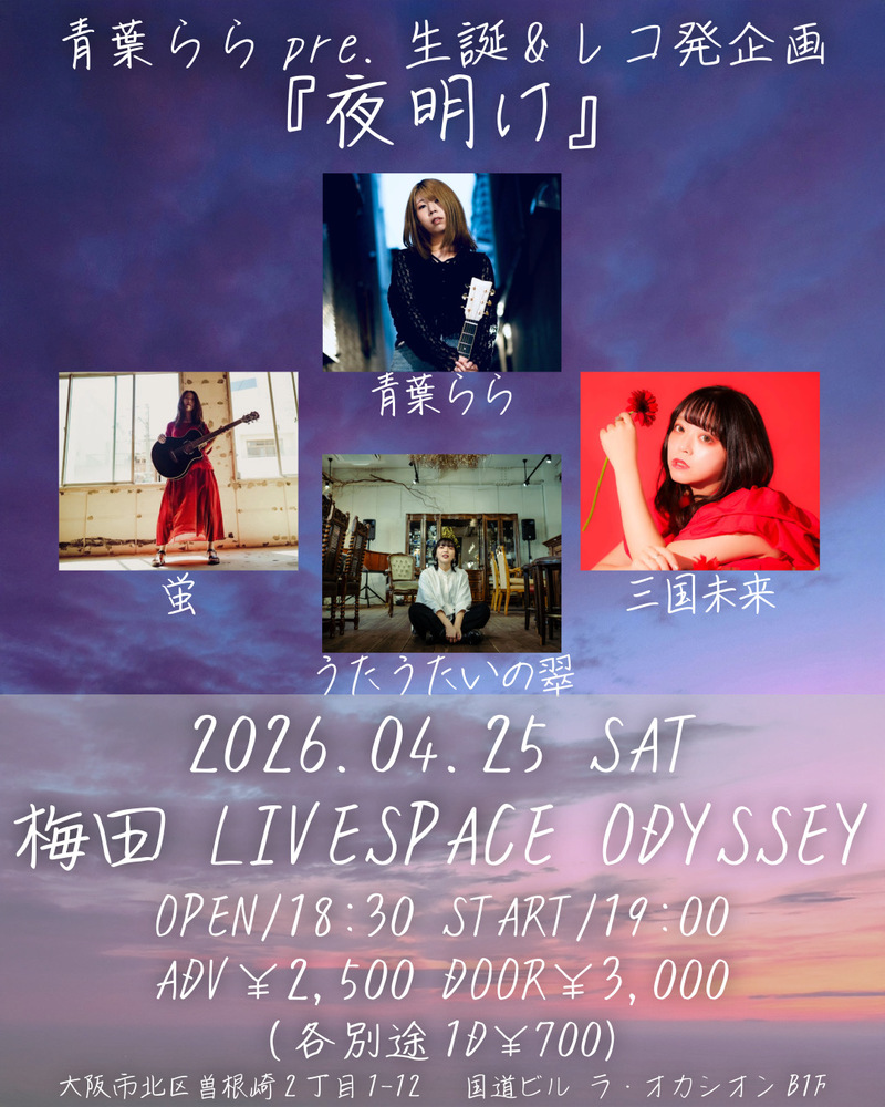 青葉ららpre.『夜明け』 SCHEDULE 2026/04/25(土) - 2026/04/26(日) 梅田ODYSSEY OPEN 18:30 / START 19:00 ADV ¥2,500 / DOOR ¥3,000 出演時間♫20:10〜 w/青葉らら / 蛍 / 三国未来 URLをコピーする 報告する