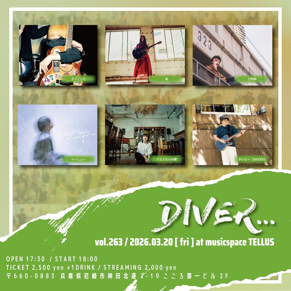 DIVER…vol.263 SCHEDULE 2026/03/20(金) - 2026/03/21(土) musicspace TELLUS OPEN 17:30 / START 18:00 TICKET ¥2,500 出演時間♫19:00〜 w/ 蛍 / 三四郎 / さいとー(SAITEKI) / べーしょー / そうごじた 配信こちら URLをコピーする 報告する